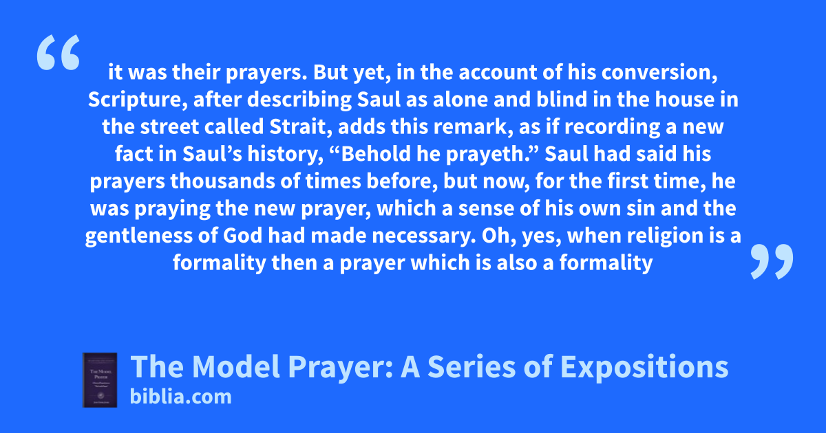 it was their prayers. But yet, in the account of his conversion, Scripture, after describing Saul as alone and blind in the house in the street called Strait, adds this remark, as if recording a new fact in Saul’s history, “Behold he prayeth.” Saul had said his prayers thousands of times before, but now, for the first time, he was praying the new prayer, which a sense of his own sin and the gentleness of God had made necessary. Oh, yes, when religion is a formality then a prayer which is also a formality