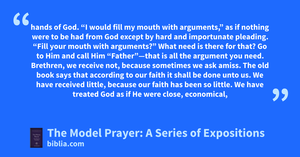 hands of God. “I would fill my mouth with arguments,” as if nothing were to be had from God except by hard and importunate pleading. “Fill your mouth with arguments?” What need is there for that? Go to Him and call Him “Father”—that is all the argument you need. Brethren, we receive not, because sometimes we ask amiss. The old book says that according to our faith it shall be done unto us. We have received little, because our faith has been so little. We have treated God as if He were close, economical,