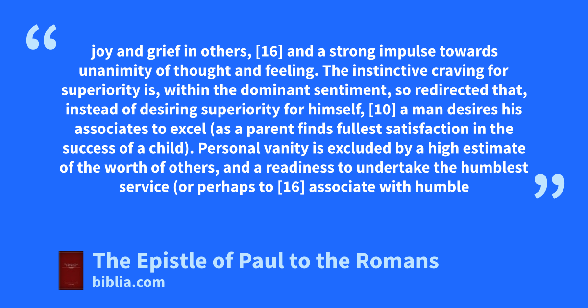 joy and grief in others, [16] and a strong impulse towards unanimity of thought and feeling. The instinctive craving for superiority is, within the dominant sentiment, so redirected that, instead of desiring superiority for himself, [10] a man desires his associates to excel (as a parent finds fullest satisfaction in the success of a child). Personal vanity is excluded by a high estimate of the worth of others, and a readiness to undertake the humblest service (or perhaps to [16] associate with humble