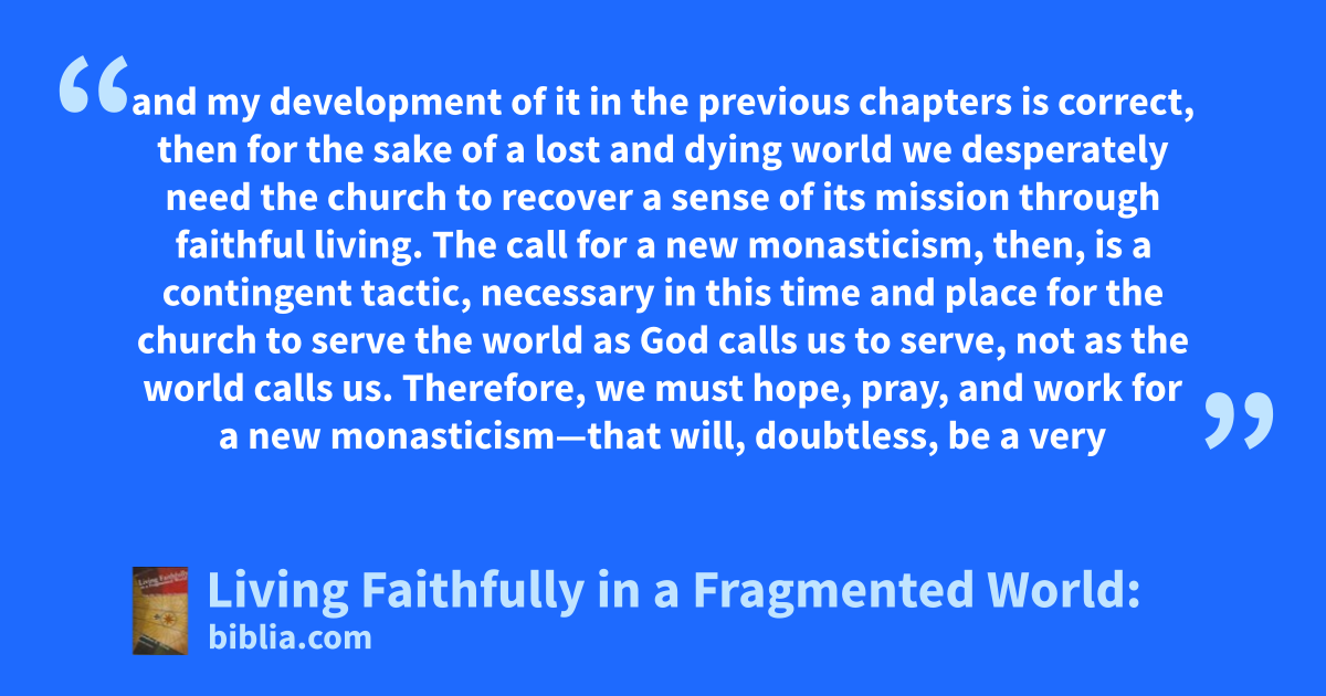 and my development of it in the previous chapters is correct, then for the sake of a lost and dying world we desperately need the church to recover a sense of its mission through faithful living. The call for a new monasticism, then, is a contingent tactic, necessary in this time and place for the church to serve the world as God calls us to serve, not as the world calls us. Therefore, we must hope, pray, and work for a new monasticism—that will, doubtless, be a very
