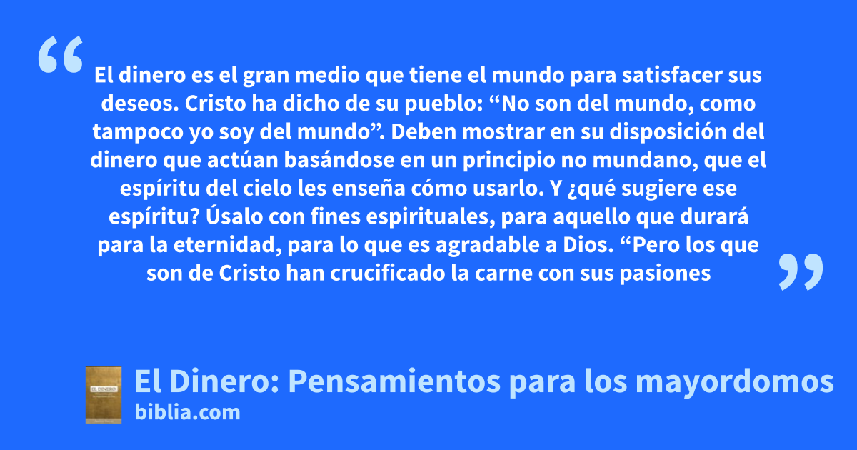 El dinero es el gran medio que tiene el mundo para satisfacer sus deseos. Cristo ha dicho de su pueblo: “No son del mundo, como tampoco yo soy del mundo”. Deben mostrar en su disposición del dinero que actúan basándose en un principio no mundano, que el espíritu del cielo les enseña cómo usarlo. Y ¿qué sugiere ese espíritu? Úsalo con fines espirituales, para aquello que durará para la eternidad, para lo que es agradable a Dios. “Pero los que son de Cristo han crucificado la carne con sus pasiones