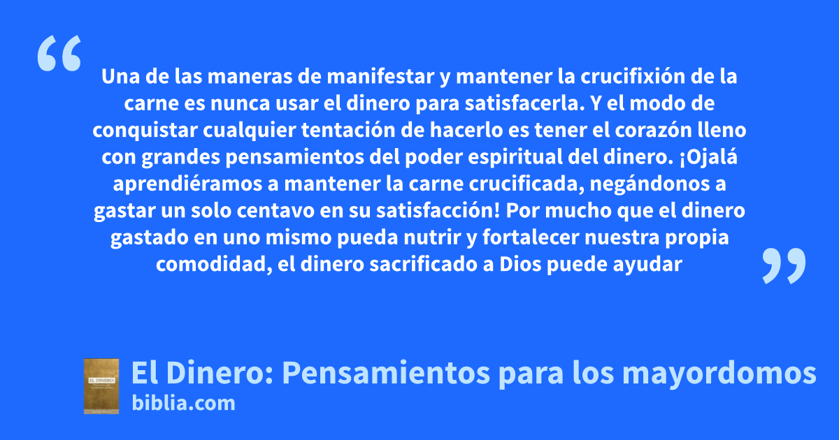 Una de las maneras de manifestar y mantener la crucifixión de la carne es nunca usar el dinero para satisfacerla. Y el modo de conquistar cualquier tentación de hacerlo es tener el corazón lleno con grandes pensamientos del poder espiritual del dinero. ¡Ojalá aprendiéramos a mantener la carne crucificada, negándonos a gastar un solo centavo en su satisfacción! Por mucho que el dinero gastado en uno mismo pueda nutrir y fortalecer nuestra propia comodidad, el dinero sacrificado a Dios puede ayudar
