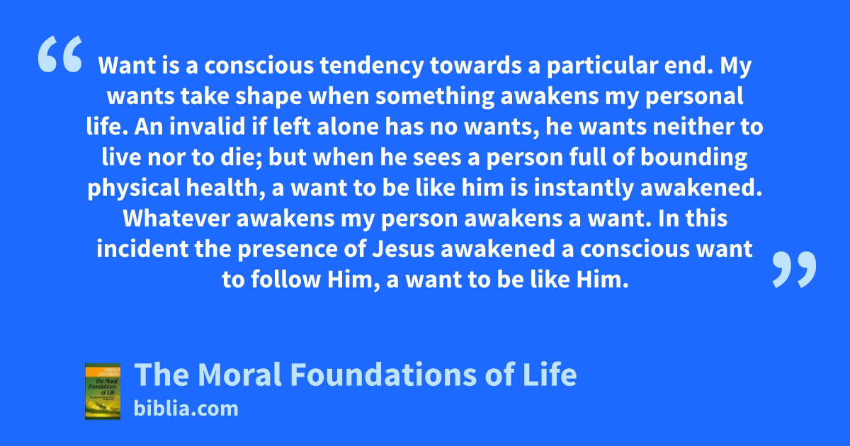 Want is a conscious tendency towards a particular end. My wants take shape when something awakens my personal life. An invalid if left alone has no wants, he wants neither to live nor to die; but when he sees a person full of bounding physical health, a want to be like him is instantly awakened. Whatever awakens my person awakens a want. In this incident the presence of Jesus awakened a conscious want to follow Him, a want to be like Him.