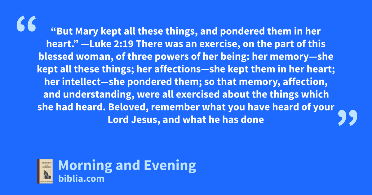 There was an exercise, on the part of this blessed woman, of three powers of her being: her memory—she kept all these things; her affections—she kept them in her heart; her intellect—she pondered them; so that memory, affection, and understanding, were all exercised about the things which she had heard. Beloved, remember what you have heard of your Lord Jesus, and what he has done for you; make your heart the golden pot of manna to preserve the memorial of the heavenly bread whereon you have fed in days gone by. Let your memory treasure up everything about Christ which you have either felt, or known, or believed, and then let your fond affections hold him fast for evermore. Love the person of your Lord! Bring forth the alabaster box of your heart, even though it be broken, and let all the precious ointment of your affection come streaming on his pierced feet. Let your intellect be exercised concerning the Lord Jesus. Meditate upon what you read: stop not at the surface; dive into the depths. Be not as the swallow which toucheth the brook with her wing, but as the fish which penetrates the lowest wave. Abide with your Lord: let him not be to you as a wayfaring man, that tarrieth for a night, but constrain him, saying, “Abide with us, for the day is far spent.” Hold him, and do not let him go. The word “ponder,” means to weigh. Make ready the balances of judgment. Oh, but where are the scales that can weigh the Lord Christ? “He taketh up the isles as a very little thing:”—who shall take him up? “He weigheth the mountains in scales”—in what scales shall we weigh him? Be it so, if your understanding cannot comprehend, let your affections apprehend; and if your spirit cannot compass the Lord Jesus in the grasp of understanding, let it embrace him in the arms of affection.