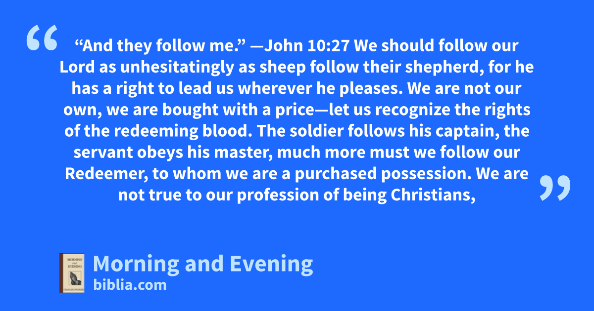 We should follow our Lord as unhesitatingly as sheep follow their shepherd, for he has a right to lead us wherever he pleases. We are not our own, we are bought with a price—let us recognize the rights of the redeeming blood. The soldier follows his captain, the servant obeys his master, much more must we follow our Redeemer, to whom we are a purchased possession. We are not true to our profession of being Christians, if we question the bidding of our Leader and Commander. Submission is our duty, cavilling is our folly. Often might our Lord say to us as to Peter, “What is that to thee? Follow thou me.” Wherever Jesus may lead us, he goes before us. If we know not where we go, we know with whom we go. With such a companion, who will dread the perils of the road? The journey may be long, but his everlasting arms will carry us to the end. The presence of Jesus is the assurance of eternal salvation, because he lives, we shall live also. We should follow Christ in simplicity and faith, because the paths in which he leads us all end in glory and immortality. It is true they may not be smooth paths—they may be covered with sharp flinty trials, but they lead to the “city which hath foundations, whose builder and maker is God.” “All the paths of the Lord are mercy and truth unto such as keep his covenant.” Let us put full trust in our Leader, since we know that, come prosperity or adversity, sickness or health, popularity or contempt, his purpose shall be worked out, and that purpose shall be pure, unmingled good to every heir of mercy. We shall find it sweet to go up the bleak side of the hill with Christ; and when rain and snow blow into our faces, his dear love will make us far more blest than those who sit at home and warm their hands at the world’s fire. To the top of Amana, to the dens of lions, or to the hills of leopards, we will follow our Beloved. Precious Jesus, draw us, and we will run after thee.