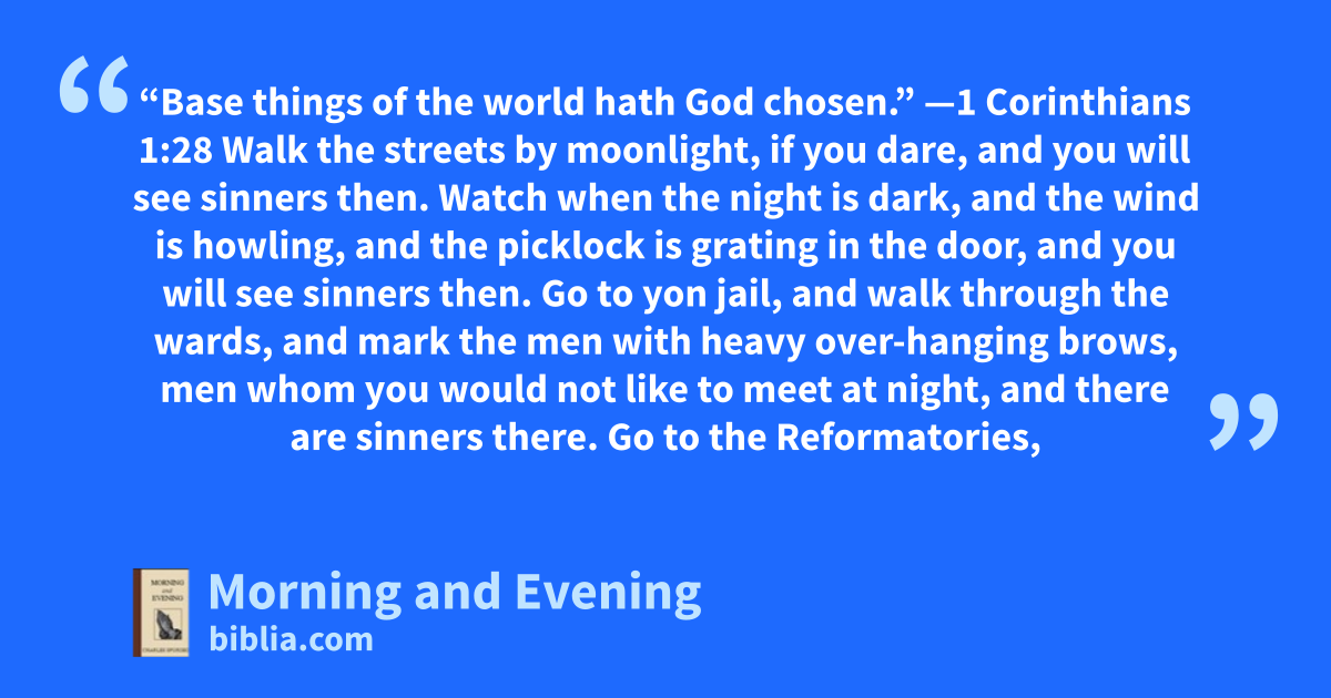 Walk the streets by moonlight, if you dare, and you will see sinners then. Watch when the night is dark, and the wind is howling, and the picklock is grating in the door, and you will see sinners then. Go to yon jail, and walk through the wards, and mark the men with heavy over-hanging brows, men whom you would not like to meet at night, and there are sinners there. Go to the Reformatories, and note those who have betrayed a rampant juvenile depravity, and you will see sinners there. Go across the seas to the place where a man will gnaw a bone upon which is reeking human flesh, and there is a sinner there. Go where you will, you need not ransack earth to find sinners, for they are common enough; you may find them in every lane and street of every city, and town, and village, and hamlet. It is for such that Jesus died. If you will select me the grossest specimen of humanity, if he be but born of woman, I will have hope of him yet, because Jesus Christ is come to seek and to save sinners. Electing love has selected some of the worst to be made the best. Pebbles of the brook grace turns into jewels for the crown-royal. Worthless dross he transforms into pure gold. Redeeming love has set apart many of the worst of mankind to be the reward of the Saviour’s passion. Effectual grace calls forth many of the vilest of the vile to sit at the table of mercy, and therefore let none despair.