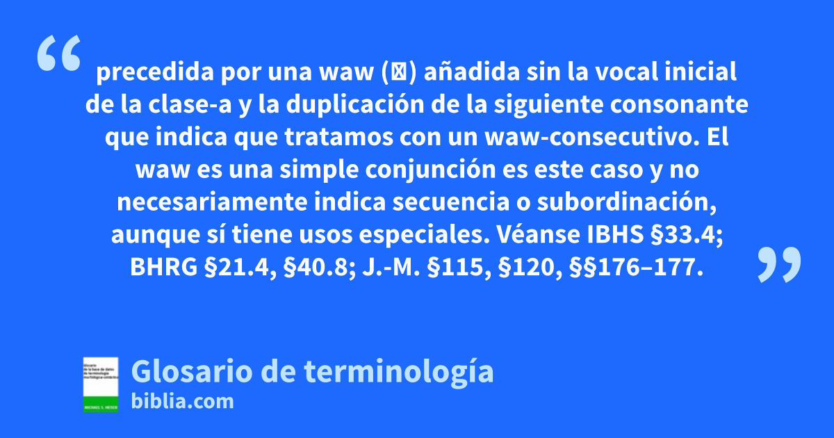precedida por una waw (ו) añadida sin la vocal inicial de la clase-a y la duplicación de la siguiente consonante que indica que tratamos con un waw-consecutivo. El waw es una simple conjunción es este caso y no necesariamente indica secuencia o subordinación, aunque sí tiene usos especiales. Véanse IBHS §33.4; BHRG §21.4, §40.8; J.-M. §115, §120, §§176–177.
