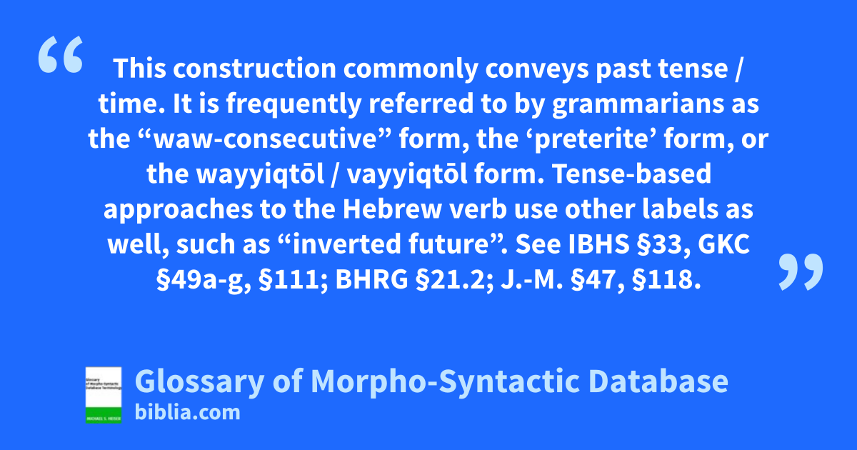 This construction commonly conveys past tense / time. It is frequently referred to by grammarians as the “waw-consecutive” form, the ‘preterite’ form, or the wayyiqtōl / vayyiqtōl form. Tense-based approaches to the Hebrew verb use other labels as well, such as “inverted future”. See IBHS §33, GKC §49a-g, §111; BHRG §21.2; J.-M. §47, §118.