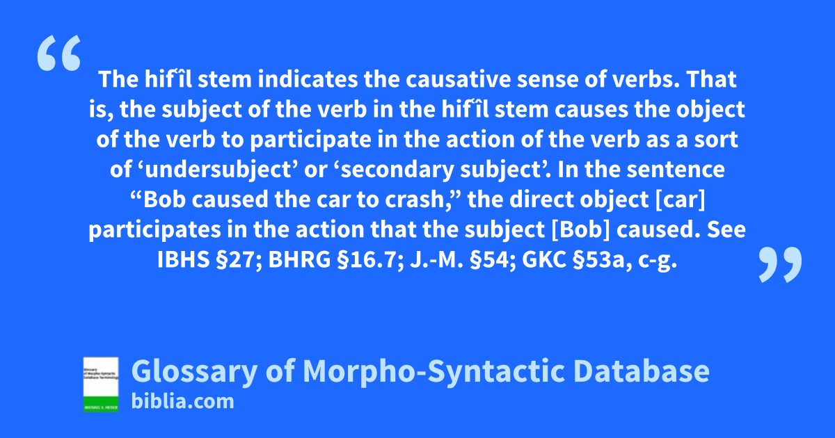 The hifʿîl stem indicates the causative sense of verbs. That is, the subject of the verb in the hifʿîl stem causes the object of the verb to participate in the action of the verb as a sort of ‘undersubject’ or ‘secondary subject’. In the sentence “Bob caused the car to crash,” the direct object [car] participates in the action that the subject [Bob] caused. See IBHS §27; BHRG §16.7; J.-M. §54; GKC §53a, c-g.