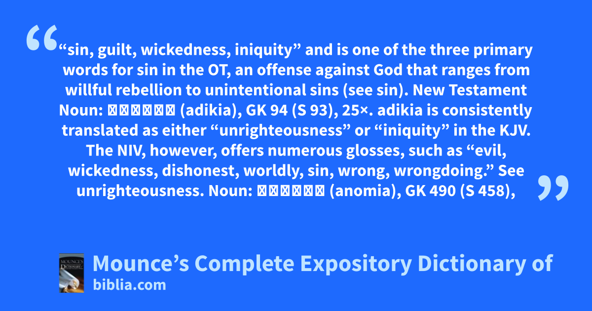 “sin, guilt, wickedness, iniquity” and is one of the three primary words for sin in the OT, an offense against God that ranges from willful rebellion to unintentional sins (see sin). New Testament Noun: ἀδικία (adikia), GK 94 (S 93), 25×. adikia is consistently translated as either “unrighteousness” or “iniquity” in the KJV. The NIV, however, offers numerous glosses, such as “evil, wickedness, dishonest, worldly, sin, wrong, wrongdoing.” See unrighteousness. Noun: ἀνομία (anomia), GK 490 (S 458),