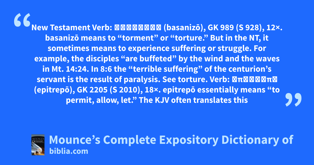 New Testament Verb: βασανιζω (basanizō), GK 989 (S 928), 12×. basanizō means to “torment” or “torture.” But in the NT, it sometimes means to experience suffering or struggle. For example, the disciples “are buffeted” by the wind and the waves in Mt. 14:24. In 8:6 the “terrible suffering” of the centurion’s servant is the result of paralysis. See torture. Verb: ἐπιτρέπω (epitrepō), GK 2205 (S 2010), 18×. epitrepō essentially means “to permit, allow, let.” The KJV often translates this