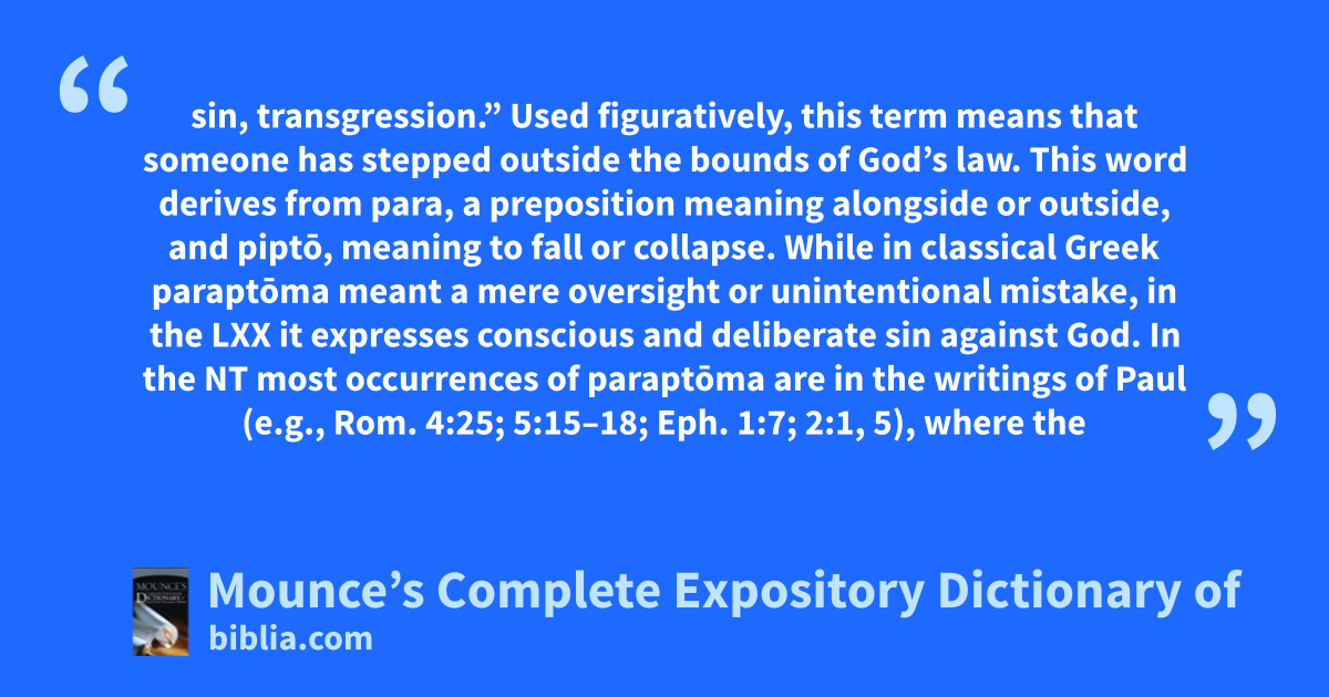 sin, transgression.” Used figuratively, this term means that someone has stepped outside the bounds of God’s law. This word derives from para, a preposition meaning alongside or outside, and piptō, meaning to fall or collapse. While in classical Greek paraptōma meant a mere oversight or unintentional mistake, in the LXX it expresses conscious and deliberate sin against God. In the NT most occurrences of paraptōma are in the writings of Paul (e.g., Rom. 4:25; 5:15–18; Eph. 1:7; 2:1, 5), where the