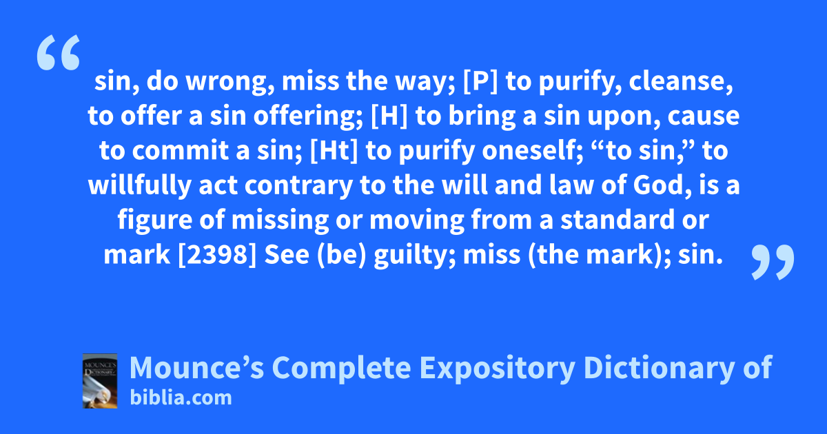 sin, do wrong, miss the way; [P] to purify, cleanse, to offer a sin offering; [H] to bring a sin upon, cause to commit a sin; [Ht] to purify oneself; “to sin,” to willfully act contrary to the will and law of God, is a figure of missing or moving from a standard or mark [2398] See (be) guilty; miss (the mark); sin.