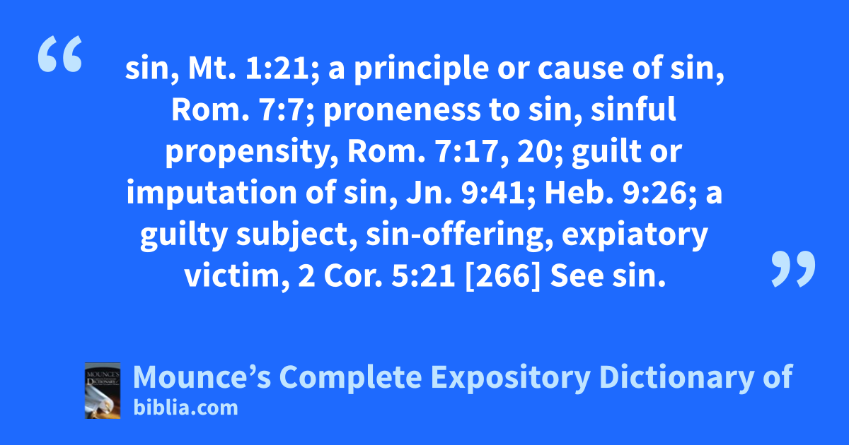 sin, Mt. 1:21; a principle or cause of sin, Rom. 7:7; proneness to sin, sinful propensity, Rom. 7:17, 20; guilt or imputation of sin, Jn. 9:41; Heb. 9:26; a guilty subject, sin-offering, expiatory victim, 2 Cor. 5:21 [266] See sin.