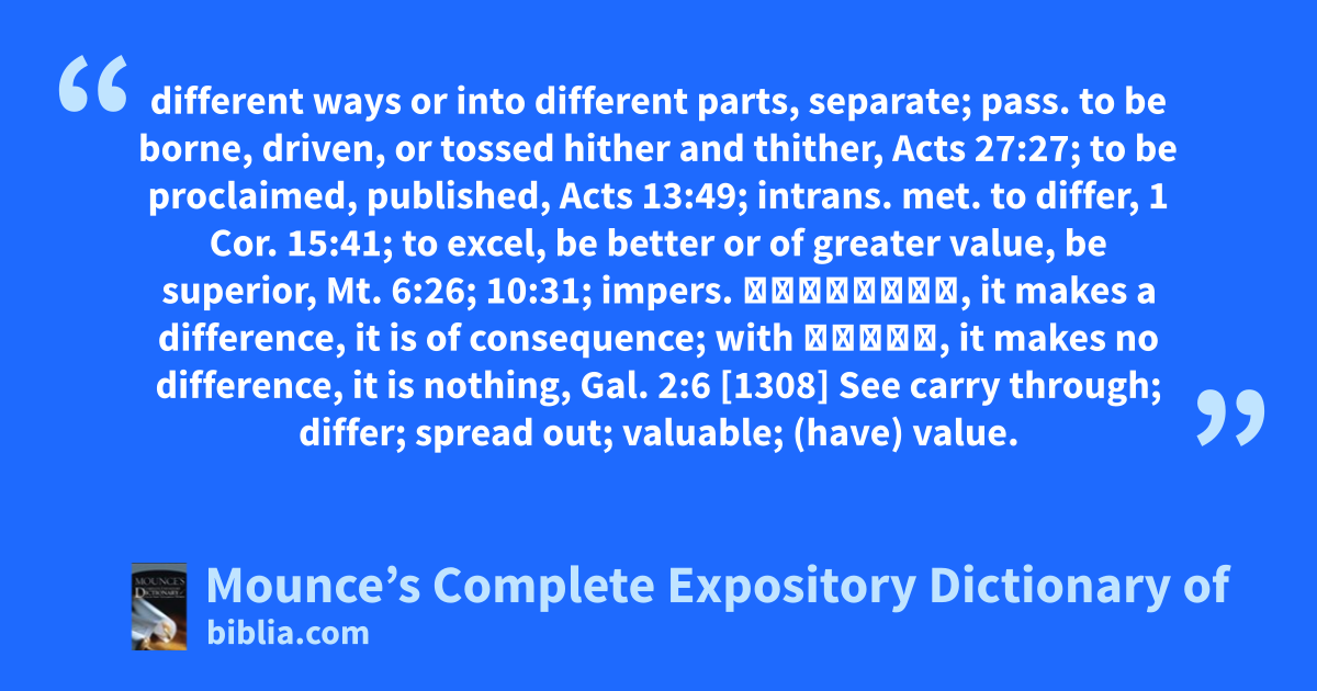 different ways or into different parts, separate; pass. to be borne, driven, or tossed hither and thither, Acts 27:27; to be proclaimed, published, Acts 13:49; intrans. met. to differ, 1 Cor. 15:41; to excel, be better or of greater value, be superior, Mt. 6:26; 10:31; impers. διαφέρει, it makes a difference, it is of consequence; with οὑδέν, it makes no difference, it is nothing, Gal. 2:6 [1308] See carry through; differ; spread out; valuable; (have) value.