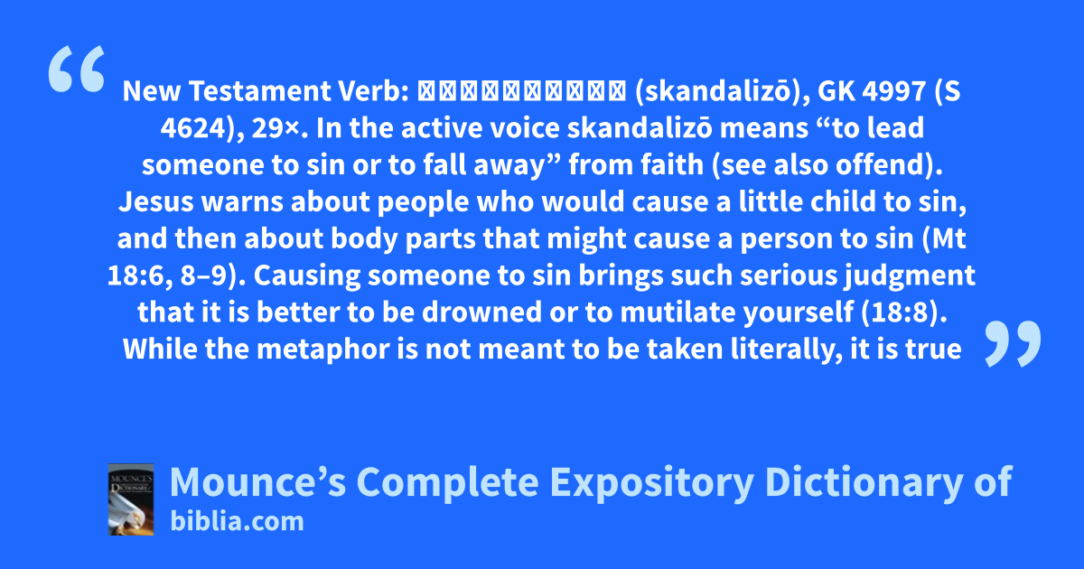 New Testament Verb: σκανδαλίζω (skandalizō), GK 4997 (S 4624), 29×. In the active voice skandalizō means “to lead someone to sin or to fall away” from faith (see also offend). Jesus warns about people who would cause a little child to sin, and then about body parts that might cause a person to sin (Mt 18:6, 8–9). Causing someone to sin brings such serious judgment that it is better to be drowned or to mutilate yourself (18:8). While the metaphor is not meant to be taken literally, it is true