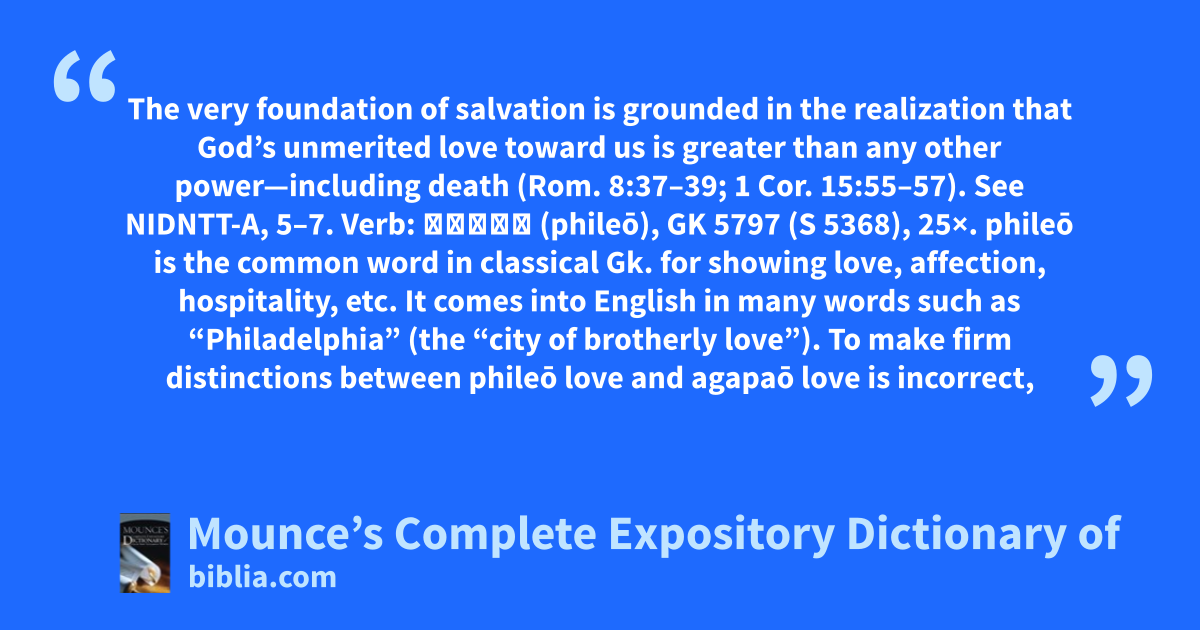 The very foundation of salvation is grounded in the realization that God’s unmerited love toward us is greater than any other power—including death (Rom. 8:37–39; 1 Cor. 15:55–57). See NIDNTT-A, 5–7. Verb: φιλέω (phileō), GK 5797 (S 5368), 25×. phileō is the common word in classical Gk. for showing love, affection, hospitality, etc. It comes into English in many words such as “Philadelphia” (the “city of brotherly love”). To make firm distinctions between phileō love and agapaō love is incorrect,