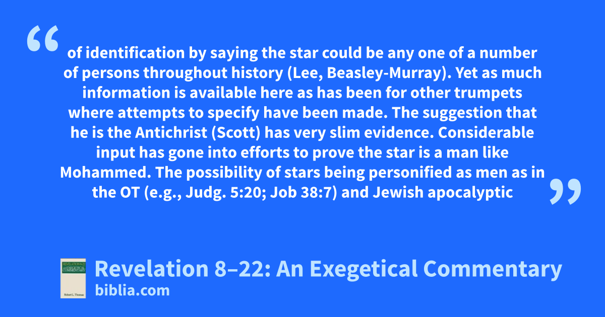 of identification by saying the star could be any one of a number of persons throughout history (Lee, Beasley-Murray). Yet as much information is available here as has been for other trumpets where attempts to specify have been made. The suggestion that he is the Antichrist (Scott) has very slim evidence. Considerable input has gone into efforts to prove the star is a man like Mohammed. The possibility of stars being personified as men as in the OT (e.g., Judg. 5:20; Job 38:7) and Jewish apocalyptic