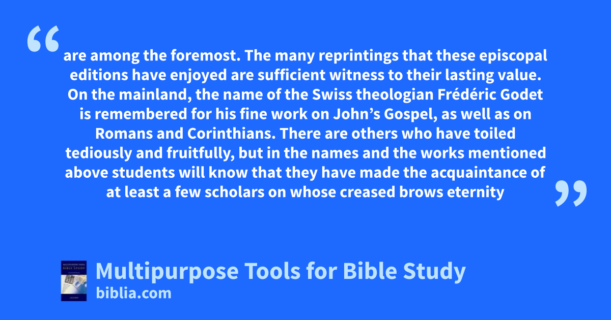 are among the foremost. The many reprintings that these episcopal editions have enjoyed are sufficient witness to their lasting value. On the mainland, the name of the Swiss theologian Frédéric Godet is remembered for his fine work on John’s Gospel, as well as on Romans and Corinthians. There are others who have toiled tediously and fruitfully, but in the names and the works mentioned above students will know that they have made the acquaintance of at least a few scholars on whose creased brows eternity