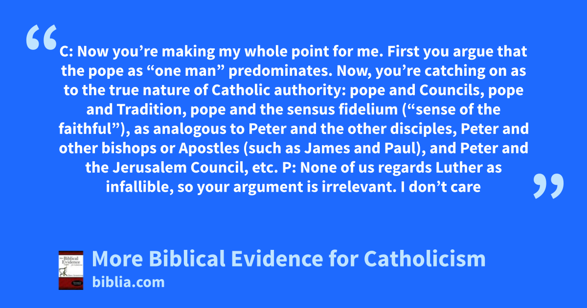 C: Now you’re making my whole point for me. First you argue that the pope as “one man” predominates. Now, you’re catching on as to the true nature of Catholic authority: pope and Councils, pope and Tradition, pope and the sensus fidelium (“sense of the faithful”), as analogous to Peter and the other disciples, Peter and other bishops or Apostles (such as James and Paul), and Peter and the Jerusalem Council, etc. P: None of us regards Luther as infallible, so your argument is irrelevant. I don’t care