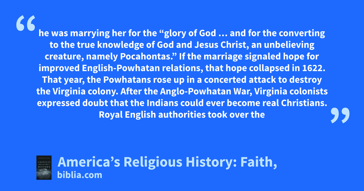he was marrying her for the “glory of God … and for the converting to the true knowledge of God and Jesus Christ, an unbelieving creature, namely Pocahontas.” If the marriage signaled hope for improved English-Powhatan relations, that hope collapsed in 1622. That year, the Powhatans rose up in a concerted attack to destroy the Virginia colony. After the Anglo-Powhatan War, Virginia colonists expressed doubt that the Indians could ever become real Christians. Royal English authorities took over the