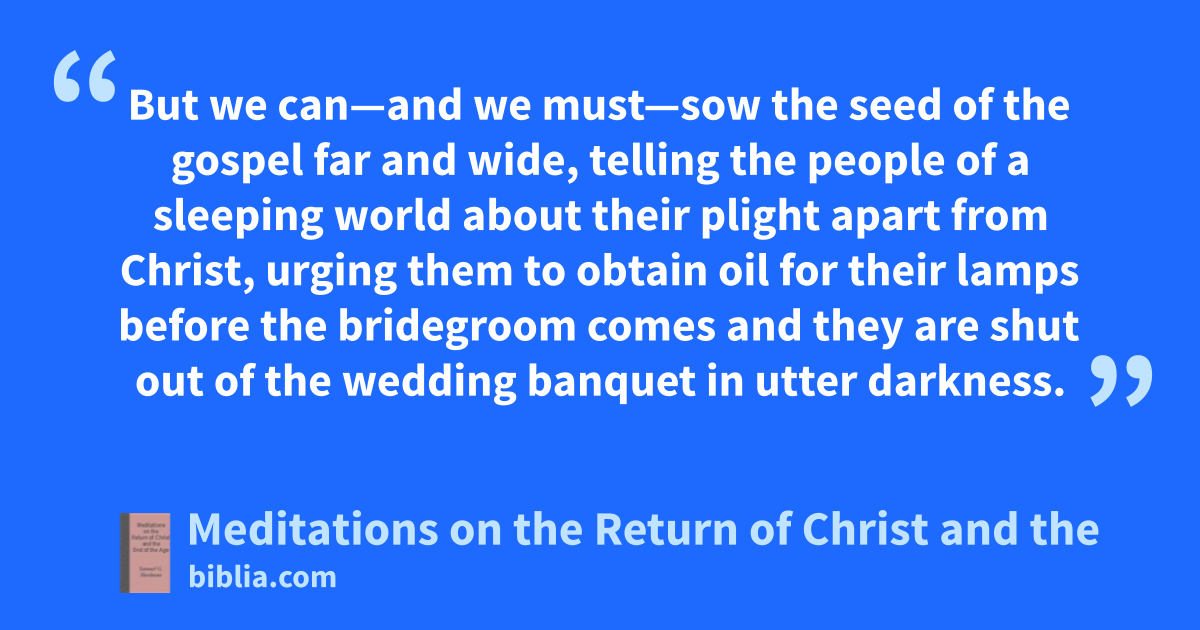 But we can—and we must—sow the seed of the gospel far and wide, telling the people of a sleeping world about their plight apart from Christ, urging them to obtain oil for their lamps before the bridegroom comes and they are shut out of the wedding banquet in utter darkness.