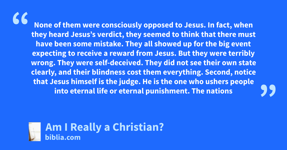None of them were consciously opposed to Jesus. In fact, when they heard Jesus’s verdict, they seemed to think that there must have been some mistake. They all showed up for the big event expecting to receive a reward from Jesus. But they were terribly wrong. They were self-deceived. They did not see their own state clearly, and their blindness cost them everything. Second, notice that Jesus himself is the judge. He is the one who ushers people into eternal life or eternal punishment. The nations