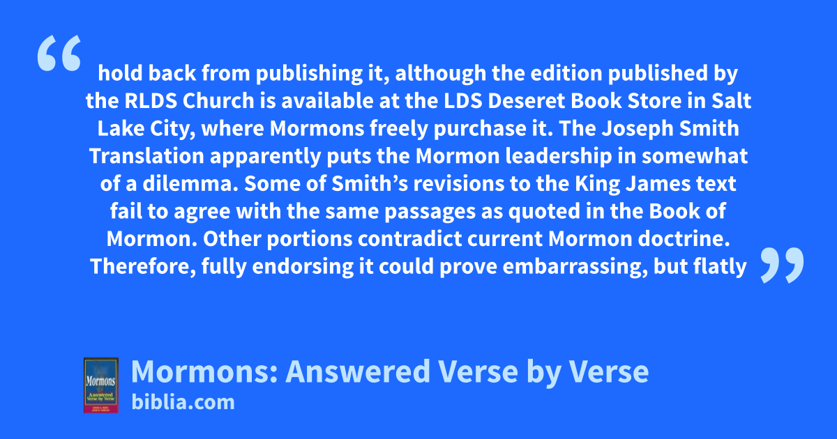hold back from publishing it, although the edition published by the RLDS Church is available at the LDS Deseret Book Store in Salt Lake City, where Mormons freely purchase it. The Joseph Smith Translation apparently puts the Mormon leadership in somewhat of a dilemma. Some of Smith’s revisions to the King James text fail to agree with the same passages as quoted in the Book of Mormon. Other portions contradict current Mormon doctrine. Therefore, fully endorsing it could prove embarrassing, but flatly
