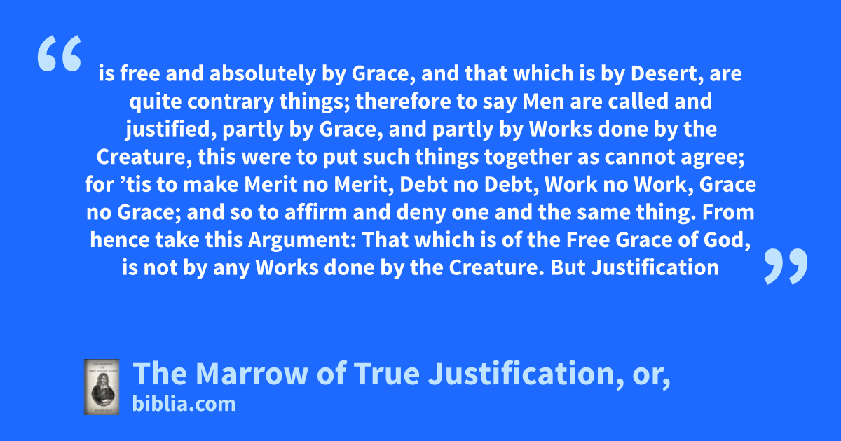 is free and absolutely by Grace, and that which is by Desert, are quite contrary things; therefore to say Men are called and justified, partly by Grace, and partly by Works done by the Creature, this were to put such things together as cannot agree; for ’tis to make Merit no Merit, Debt no Debt, Work no Work, Grace no Grace; and so to affirm and deny one and the same thing. From hence take this Argument: That which is of the Free Grace of God, is not by any Works done by the Creature. But Justification