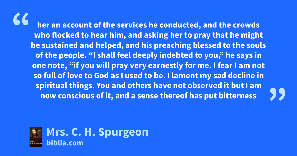 her an account of the services he conducted, and the crowds who flocked to hear him, and asking her to pray that he might be sustained and helped, and his preaching blessed to the souls of the people. “I shall feel deeply indebted to you,” he says in one note, “if you will pray very earnestly for me. I fear I am not so full of love to God as I used to be. I lament my sad decline in spiritual things. You and others have not observed it but I am now conscious of it, and a sense thereof has put bitterness