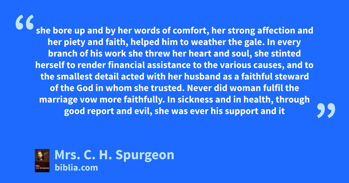 she bore up and by her words of comfort, her strong affection and her piety and faith, helped him to weather the gale. In every branch of his work she threw her heart and soul, she stinted herself to render financial assistance to the various causes, and to the smallest detail acted with her husband as a faithful steward of the God in whom she trusted. Never did woman fulfil the marriage vow more faithfully. In sickness and in health, through good report and evil, she was ever his support and it