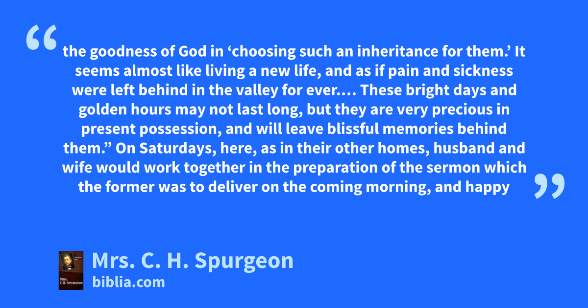 the goodness of God in ‘choosing such an inheritance for them.’ It seems almost like living a new life, and as if pain and sickness were left behind in the valley for ever.… These bright days and golden hours may not last long, but they are very precious in present possession, and will leave blissful memories behind them.” On Saturdays, here, as in their other homes, husband and wife would work together in the preparation of the sermon which the former was to deliver on the coming morning, and happy