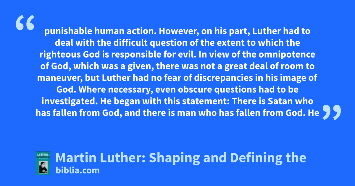 punishable human action. However, on his part, Luther had to deal with the difficult question of the extent to which the righteous God is responsible for evil. In view of the omnipotence of God, which was a given, there was not a great deal of room to maneuver, but Luther had no fear of discrepancies in his image of God. Where necessary, even obscure questions had to be investigated. He began with this statement: There is Satan who has fallen from God, and there is man who has fallen from God. He