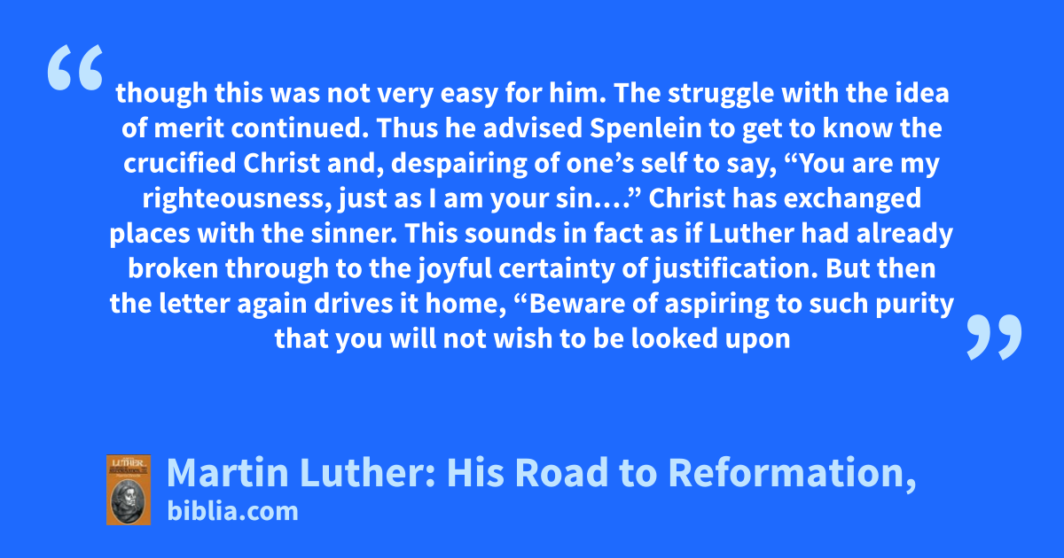 though this was not very easy for him. The struggle with the idea of merit continued. Thus he advised Spenlein to get to know the crucified Christ and, despairing of one’s self to say, “You are my righteousness, just as I am your sin.…” Christ has exchanged places with the sinner. This sounds in fact as if Luther had already broken through to the joyful certainty of justification. But then the letter again drives it home, “Beware of aspiring to such purity that you will not wish to be looked upon