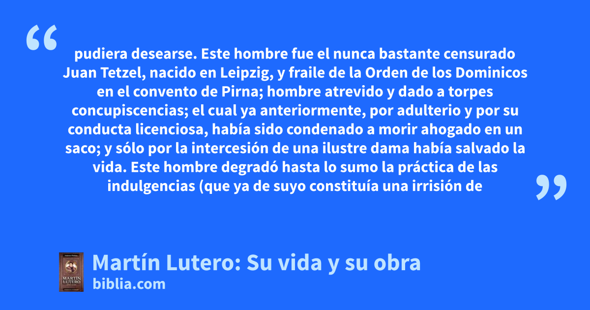 pudiera desearse. Este hombre fue el nunca bastante censurado Juan Tetzel, nacido en Leipzig, y fraile de la Orden de los Dominicos en el convento de Pirna; hombre atrevido y dado a torpes concupiscencias; el cual ya anteriormente, por adulterio y por su conducta licenciosa, había sido condenado a morir ahogado en un saco; y sólo por la intercesión de una ilustre dama había salvado la vida. Este hombre degradó hasta lo sumo la práctica de las indulgencias (que ya de suyo constituía una irrisión de