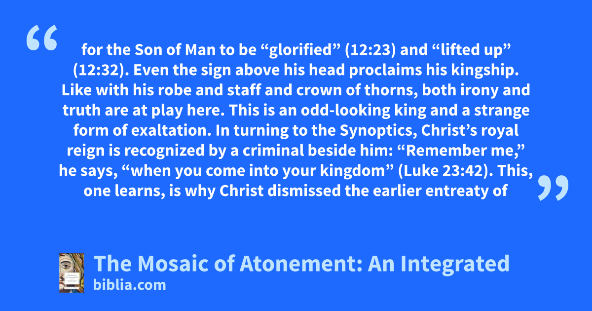 for the Son of Man to be “glorified” (12:23) and “lifted up” (12:32). Even the sign above his head proclaims his kingship. Like with his robe and staff and crown of thorns, both irony and truth are at play here. This is an odd-looking king and a strange form of exaltation. In turning to the Synoptics, Christ’s royal reign is recognized by a criminal beside him: “Remember me,” he says, “when you come into your kingdom” (Luke 23:42). This, one learns, is why Christ dismissed the earlier entreaty of