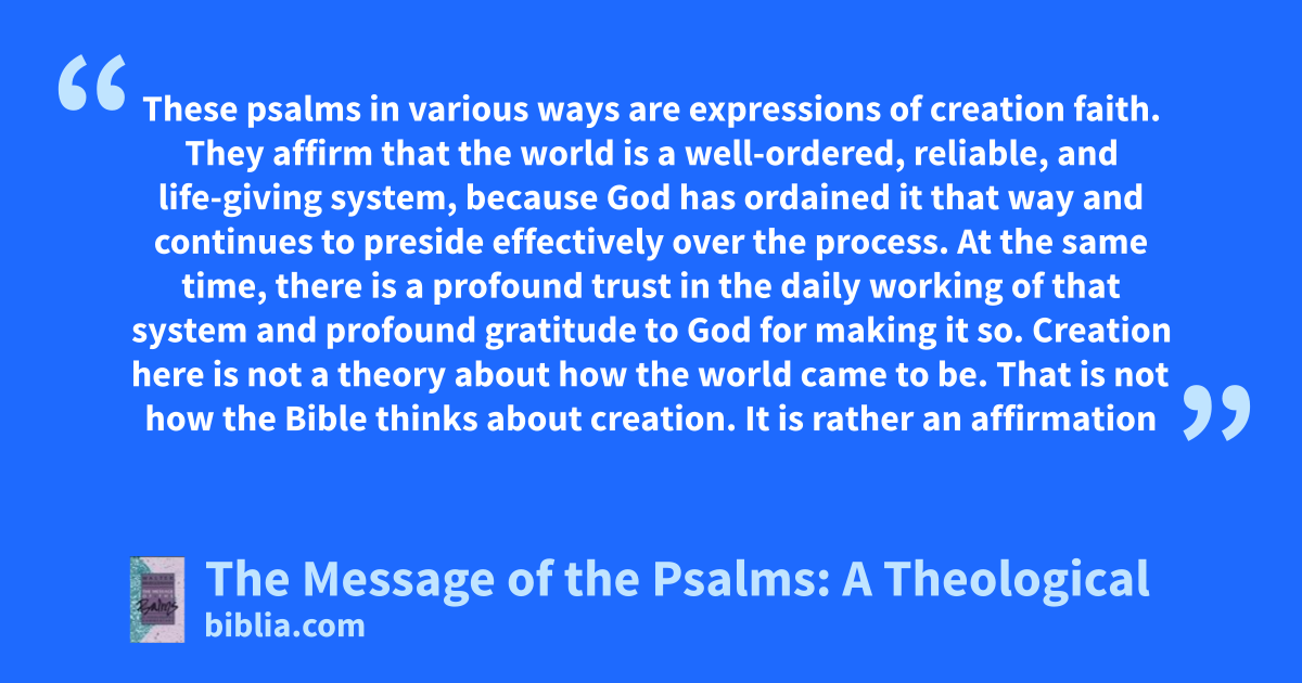 These psalms in various ways are expressions of creation faith. They affirm that the world is a well-ordered, reliable, and life-giving system, because God has ordained it that way and continues to preside effectively over the process. At the same time, there is a profound trust in the daily working of that system and profound gratitude to God for making it so. Creation here is not a theory about how the world came to be. That is not how the Bible thinks about creation. It is rather an affirmation