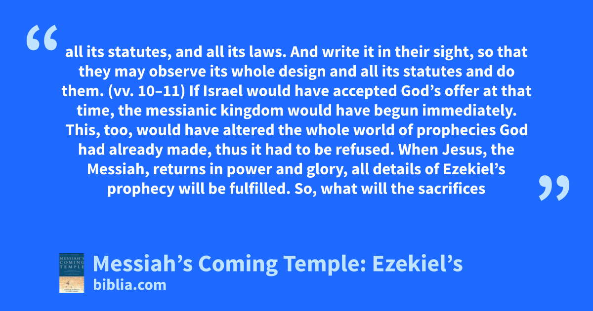 all its statutes, and all its laws. And write it in their sight, so that they may observe its whole design and all its statutes and do them. (vv. 10–11) If Israel would have accepted God’s offer at that time, the messianic kingdom would have begun immediately. This, too, would have altered the whole world of prophecies God had already made, thus it had to be refused. When Jesus, the Messiah, returns in power and glory, all details of Ezekiel’s prophecy will be fulfilled. So, what will the sacrifices