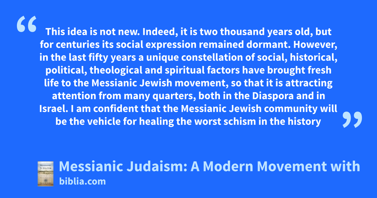 This idea is not new. Indeed, it is two thousand years old, but for centuries its social expression remained dormant. However, in the last fifty years a unique constellation of social, historical, political, theological and spiritual factors have brought fresh life to the Messianic Jewish movement, so that it is attracting attention from many quarters, both in the Diaspora and in Israel. I am confident that the Messianic Jewish community will be the vehicle for healing the worst schism in the history