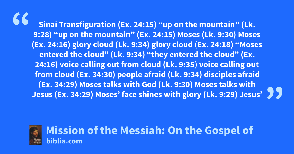 Sinai Transfiguration (Ex. 24:15) “up on the mountain” (Lk. 9:28) “up on the mountain” (Ex. 24:15) Moses (Lk. 9:30) Moses (Ex. 24:16) glory cloud (Lk. 9:34) glory cloud (Ex. 24:18) “Moses entered the cloud” (Lk. 9:34) “they entered the cloud” (Ex. 24:16) voice calling out from cloud (Lk. 9:35) voice calling out from cloud (Ex. 34:30) people afraid (Lk. 9:34) disciples afraid (Ex. 34:29) Moses talks with God (Lk. 9:30) Moses talks with Jesus (Ex. 34:29) Moses’ face shines with glory (Lk. 9:29) Jesus’