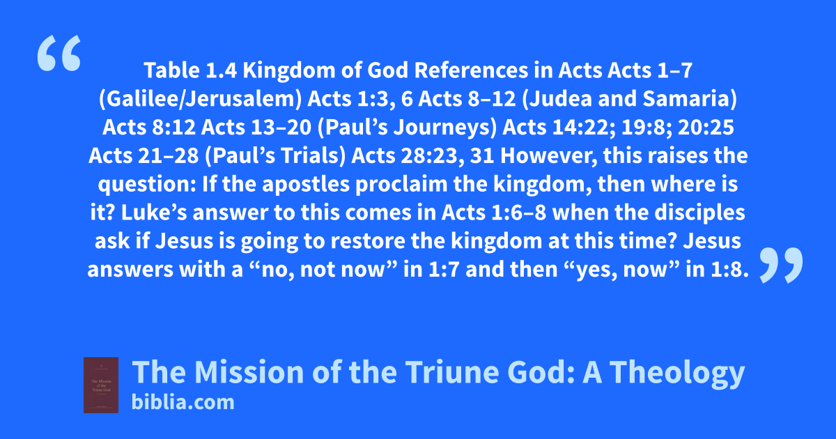 Table 1.4 Kingdom of God References in Acts Acts 1–7 (Galilee/Jerusalem) Acts 1:3, 6 Acts 8–12 (Judea and Samaria) Acts 8:12 Acts 13–20 (Paul’s Journeys) Acts 14:22; 19:8; 20:25 Acts 21–28 (Paul’s Trials) Acts 28:23, 31 However, this raises the question: If the apostles proclaim the kingdom, then where is it? Luke’s answer to this comes in Acts 1:6–8 when the disciples ask if Jesus is going to restore the kingdom at this time? Jesus answers with a “no, not now” in 1:7 and then “yes, now” in 1:8.