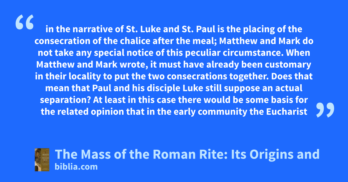 in the narrative of St. Luke and St. Paul is the placing of the consecration of the chalice after the meal; Matthew and Mark do not take any special notice of this peculiar circumstance. When Matthew and Mark wrote, it must have already been customary in their locality to put the two consecrations together. Does that mean that Paul and his disciple Luke still suppose an actual separation? At least in this case there would be some basis for the related opinion that in the early community the Eucharist