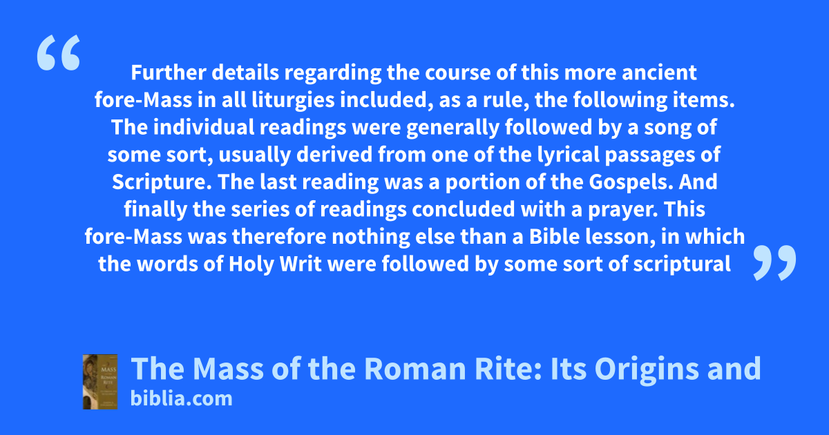 Further details regarding the course of this more ancient fore-Mass in all liturgies included, as a rule, the following items. The individual readings were generally followed by a song of some sort, usually derived from one of the lyrical passages of Scripture. The last reading was a portion of the Gospels. And finally the series of readings concluded with a prayer. This fore-Mass was therefore nothing else than a Bible lesson, in which the words of Holy Writ were followed by some sort of scriptural