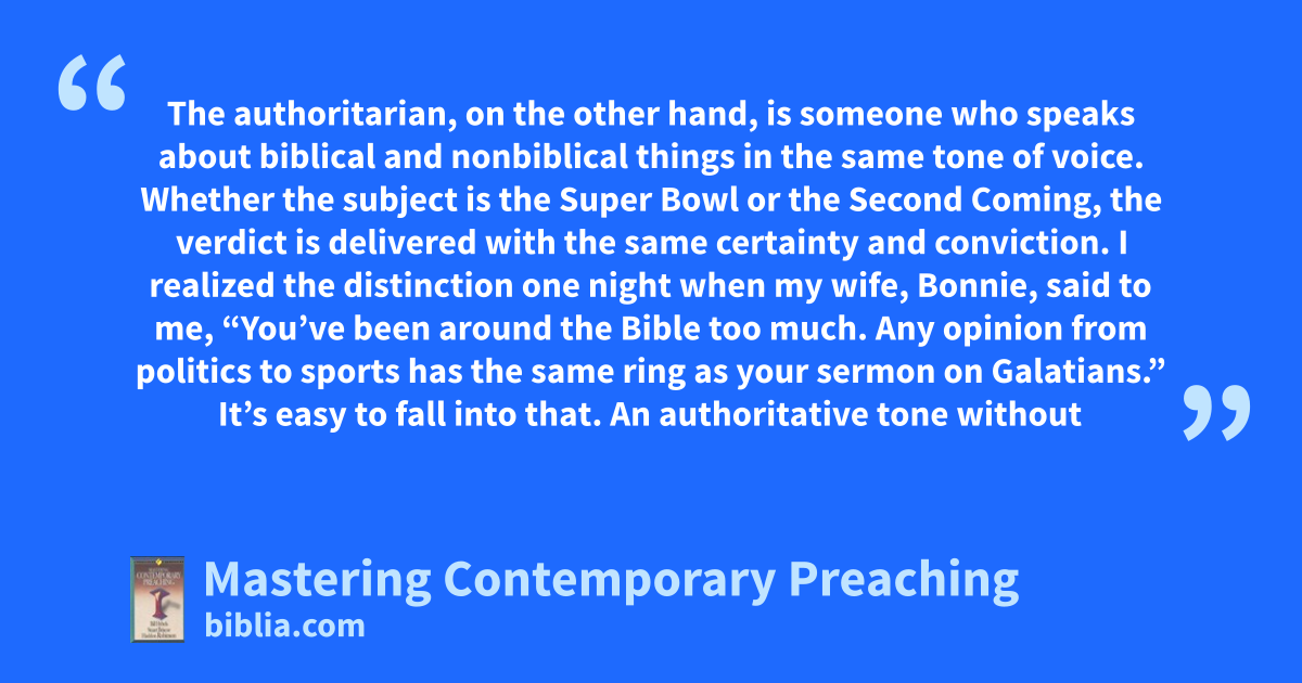 The authoritarian, on the other hand, is someone who speaks about biblical and nonbiblical things in the same tone of voice. Whether the subject is the Super Bowl or the Second Coming, the verdict is delivered with the same certainty and conviction. I realized the distinction one night when my wife, Bonnie, said to me, “You’ve been around the Bible too much. Any opinion from politics to sports has the same ring as your sermon on Galatians.” It’s easy to fall into that. An authoritative tone without