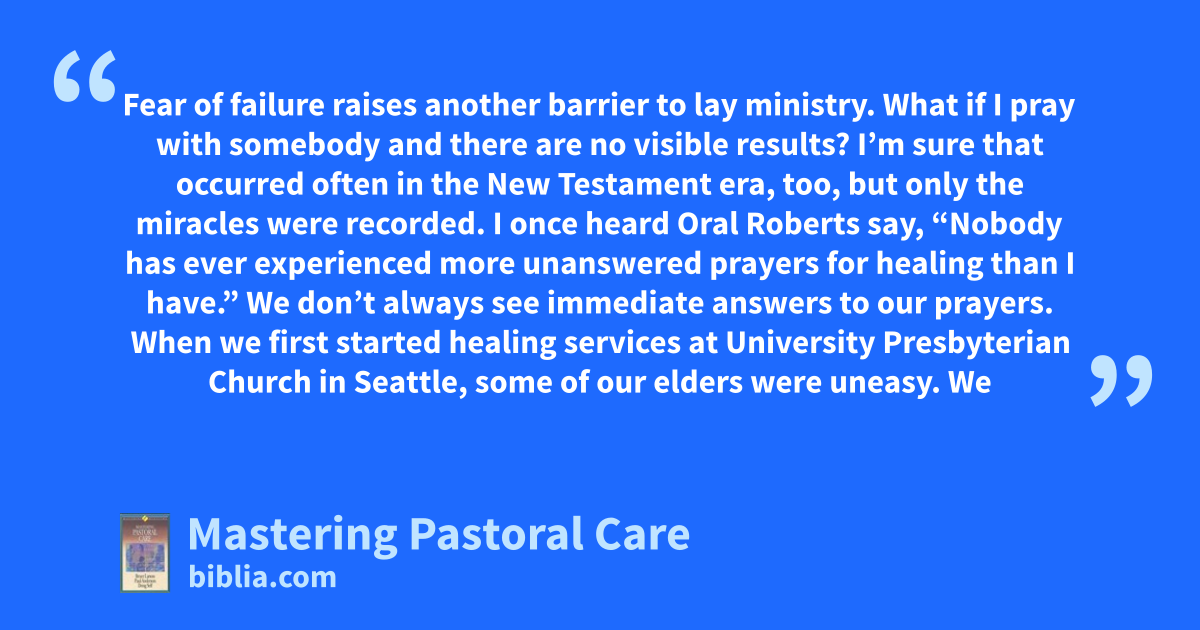 Fear of failure raises another barrier to lay ministry. What if I pray with somebody and there are no visible results? I’m sure that occurred often in the New Testament era, too, but only the miracles were recorded. I once heard Oral Roberts say, “Nobody has ever experienced more unanswered prayers for healing than I have.” We don’t always see immediate answers to our prayers. When we first started healing services at University Presbyterian Church in Seattle, some of our elders were uneasy. We