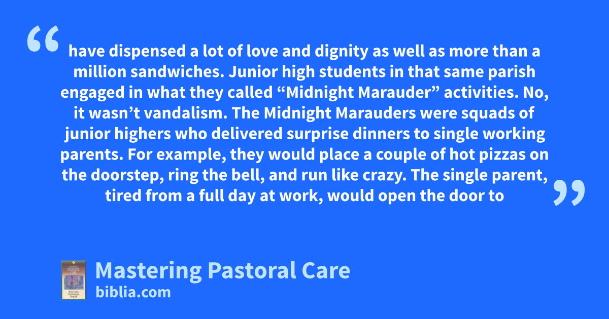 have dispensed a lot of love and dignity as well as more than a million sandwiches. Junior high students in that same parish engaged in what they called “Midnight Marauder” activities. No, it wasn’t vandalism. The Midnight Marauders were squads of junior highers who delivered surprise dinners to single working parents. For example, they would place a couple of hot pizzas on the doorstep, ring the bell, and run like crazy. The single parent, tired from a full day at work, would open the door to