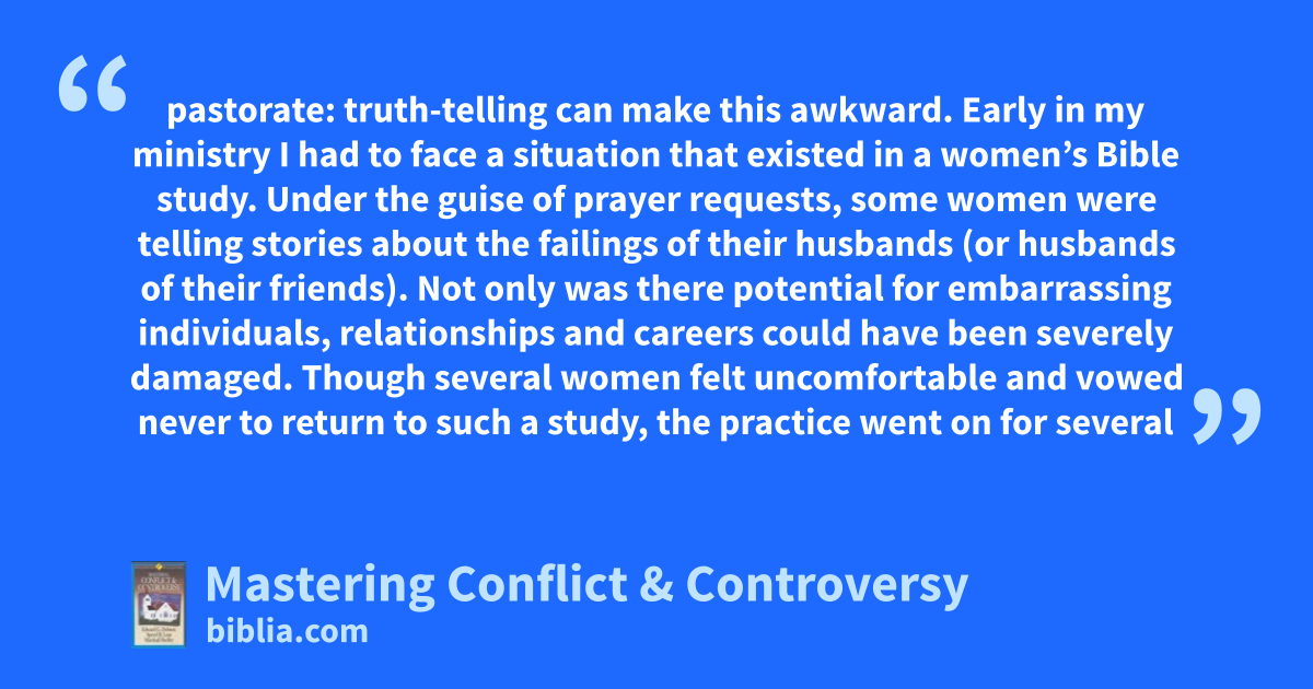 pastorate: truth-telling can make this awkward. Early in my ministry I had to face a situation that existed in a women’s Bible study. Under the guise of prayer requests, some women were telling stories about the failings of their husbands (or husbands of their friends). Not only was there potential for embarrassing individuals, relationships and careers could have been severely damaged. Though several women felt uncomfortable and vowed never to return to such a study, the practice went on for several