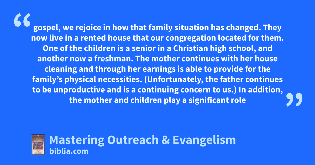 gospel, we rejoice in how that family situation has changed. They now live in a rented house that our congregation located for them. One of the children is a senior in a Christian high school, and another now a freshman. The mother continues with her house cleaning and through her earnings is able to provide for the family’s physical necessities. (Unfortunately, the father continues to be unproductive and is a continuing concern to us.) In addition, the mother and children play a significant role