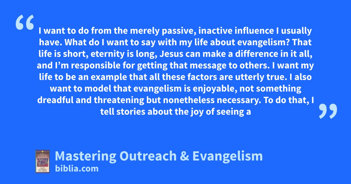 I want to do from the merely passive, inactive influence I usually have. What do I want to say with my life about evangelism? That life is short, eternity is long, Jesus can make a difference in it all, and I’m responsible for getting that message to others. I want my life to be an example that all these factors are utterly true. I also want to model that evangelism is enjoyable, not something dreadful and threatening but nonetheless necessary. To do that, I tell stories about the joy of seeing a