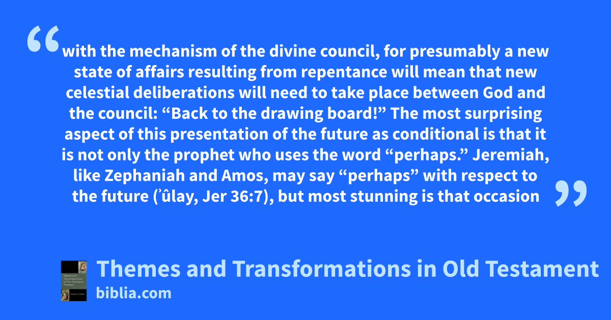 with the mechanism of the divine council, for presumably a new state of affairs resulting from repentance will mean that new celestial deliberations will need to take place between God and the council: “Back to the drawing board!” The most surprising aspect of this presentation of the future as conditional is that it is not only the prophet who uses the word “perhaps.” Jeremiah, like Zephaniah and Amos, may say “perhaps” with respect to the future (ʾûlay, Jer 36:7), but most stunning is that occasion
